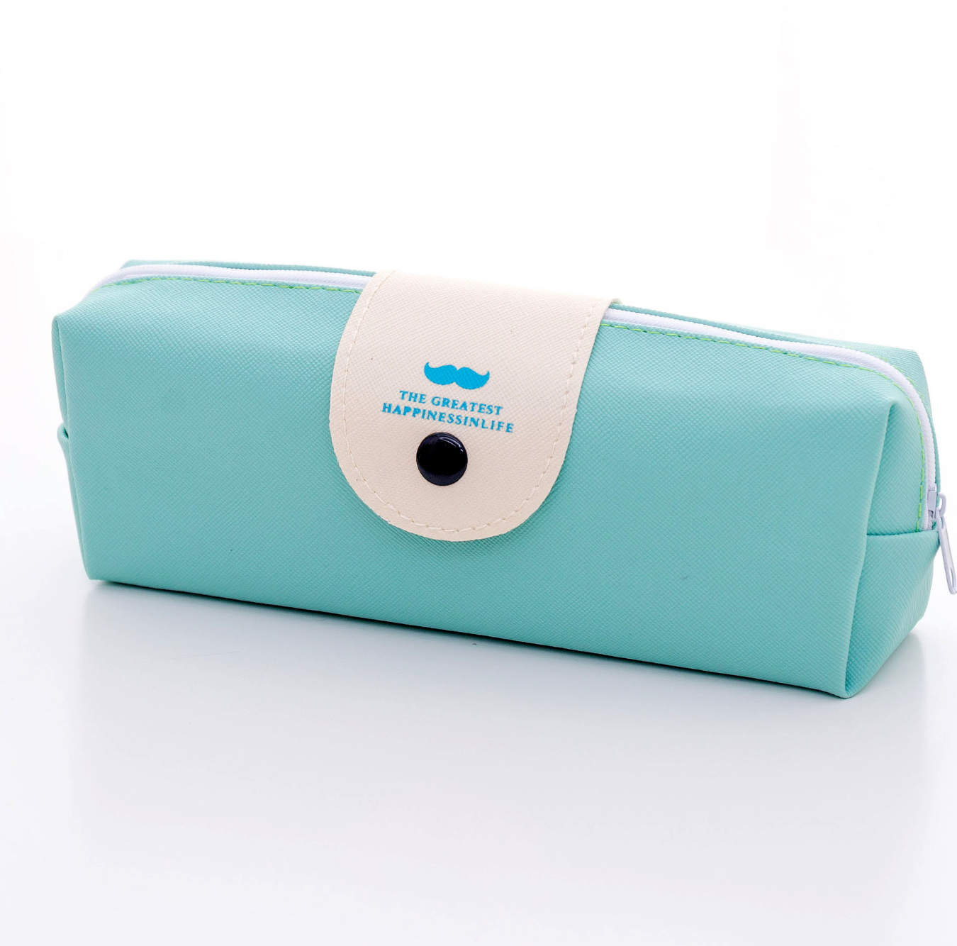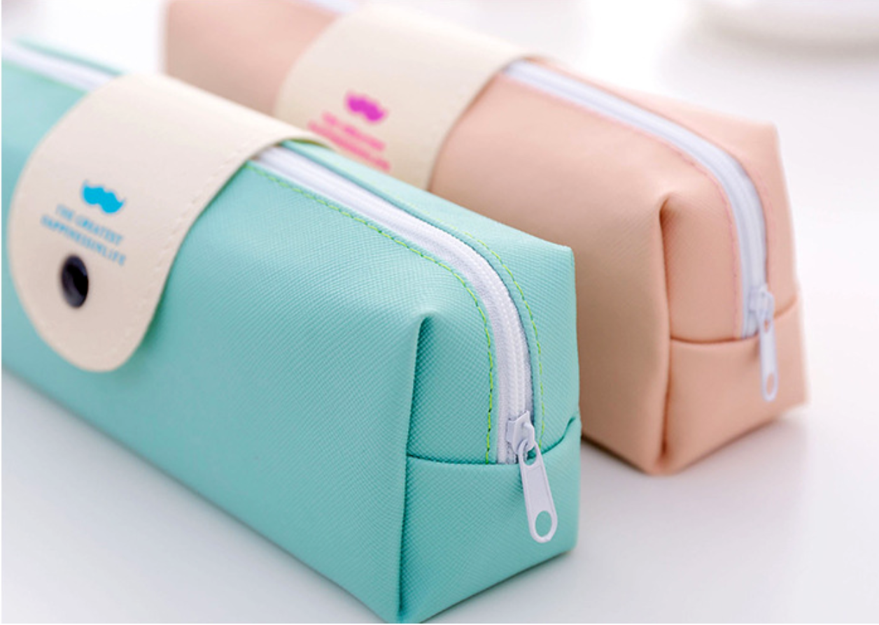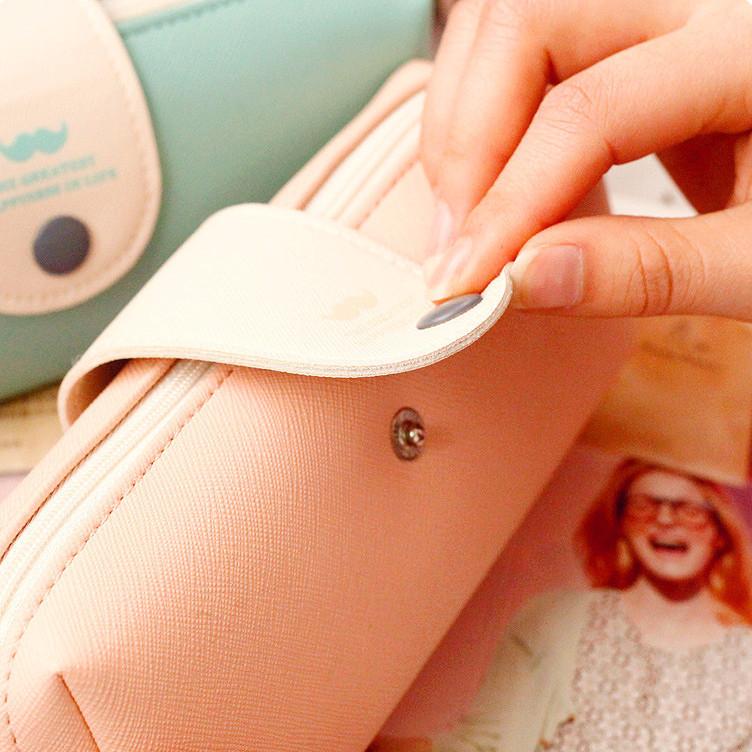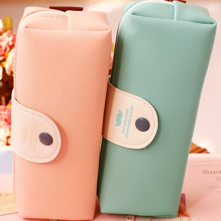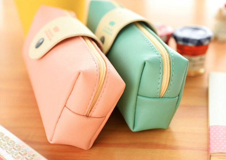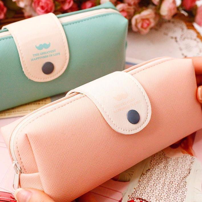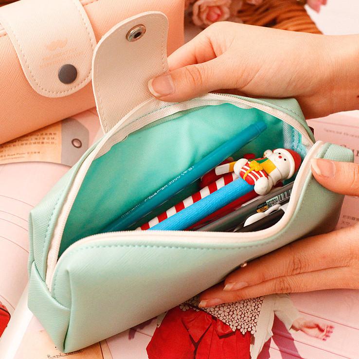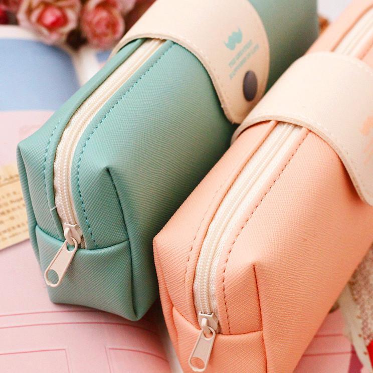 This cute pastel color pencil case is made out of PU leather and it is waterproof. It is very spacious and can carry a large amount of pens and writting supplies. It's perfect to carry to school.