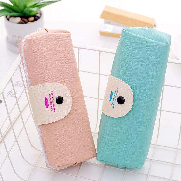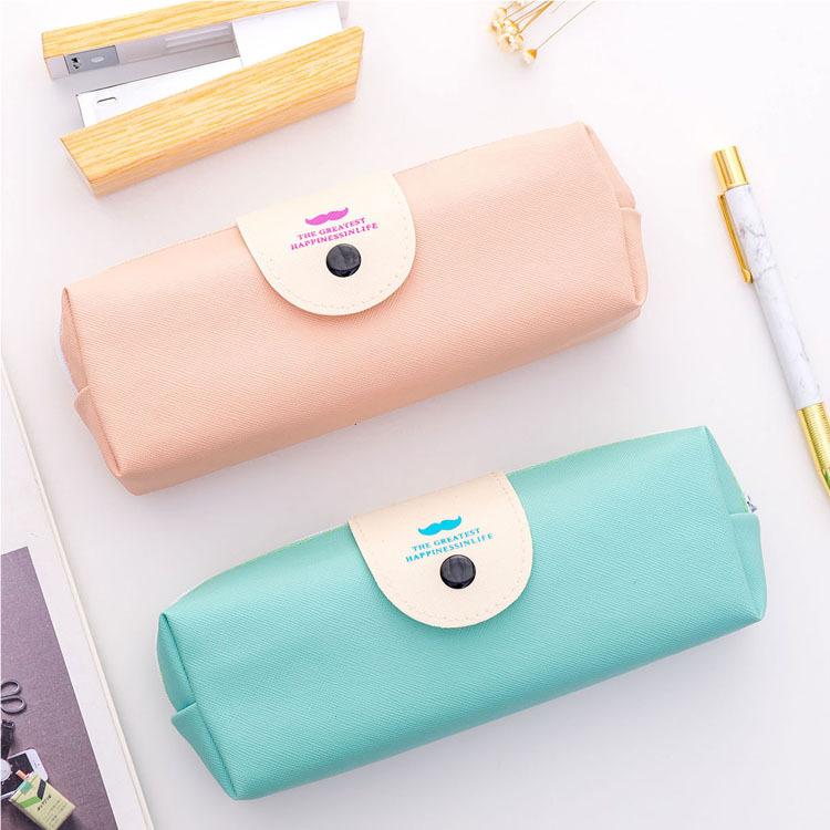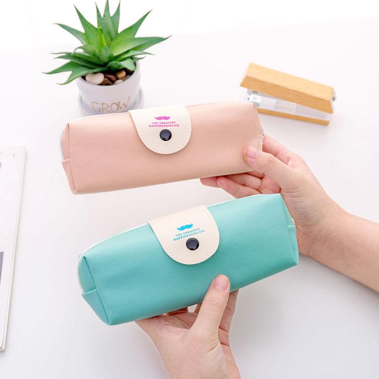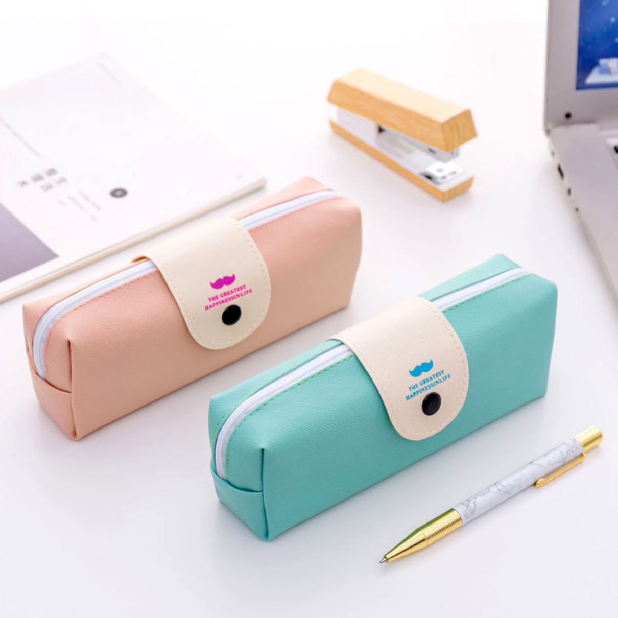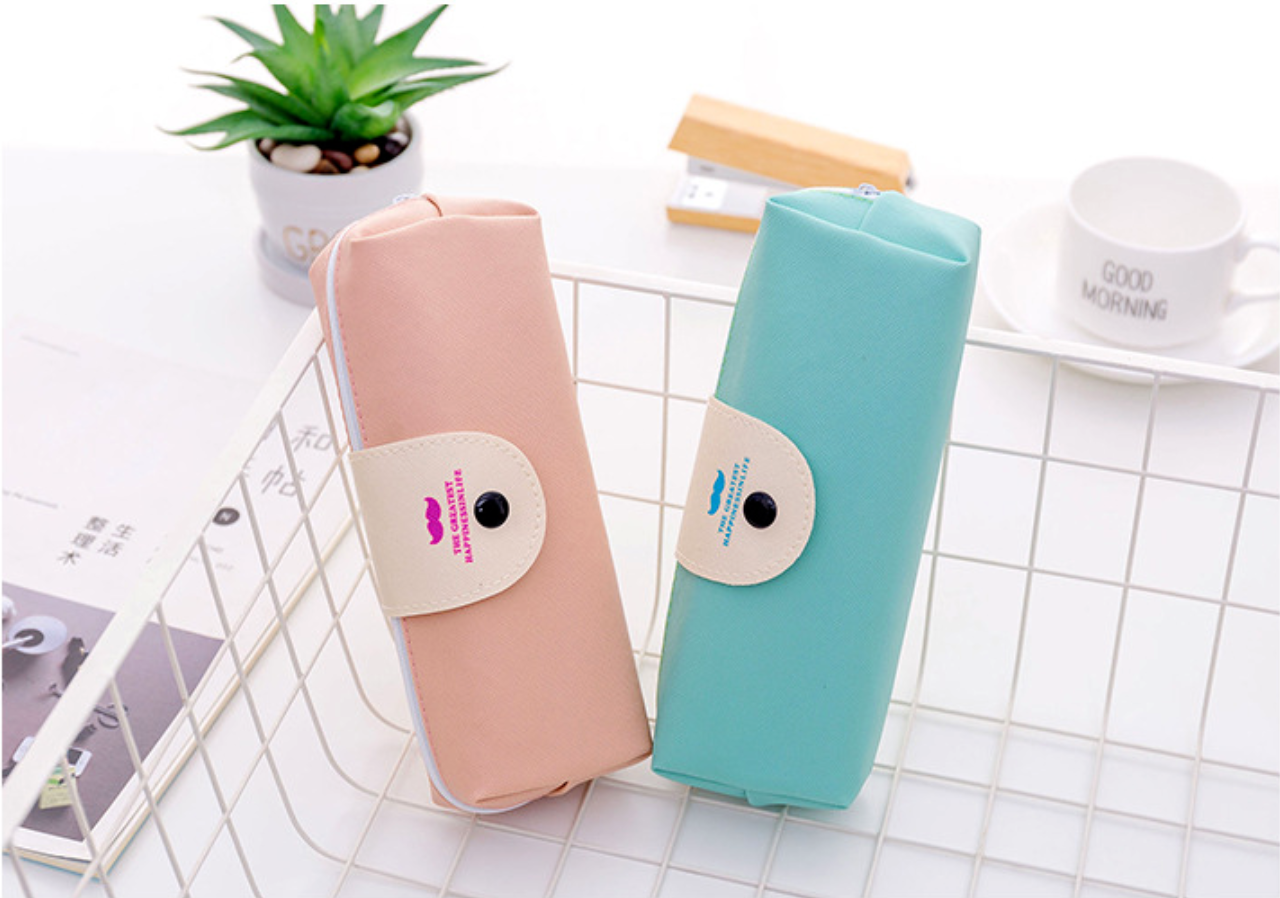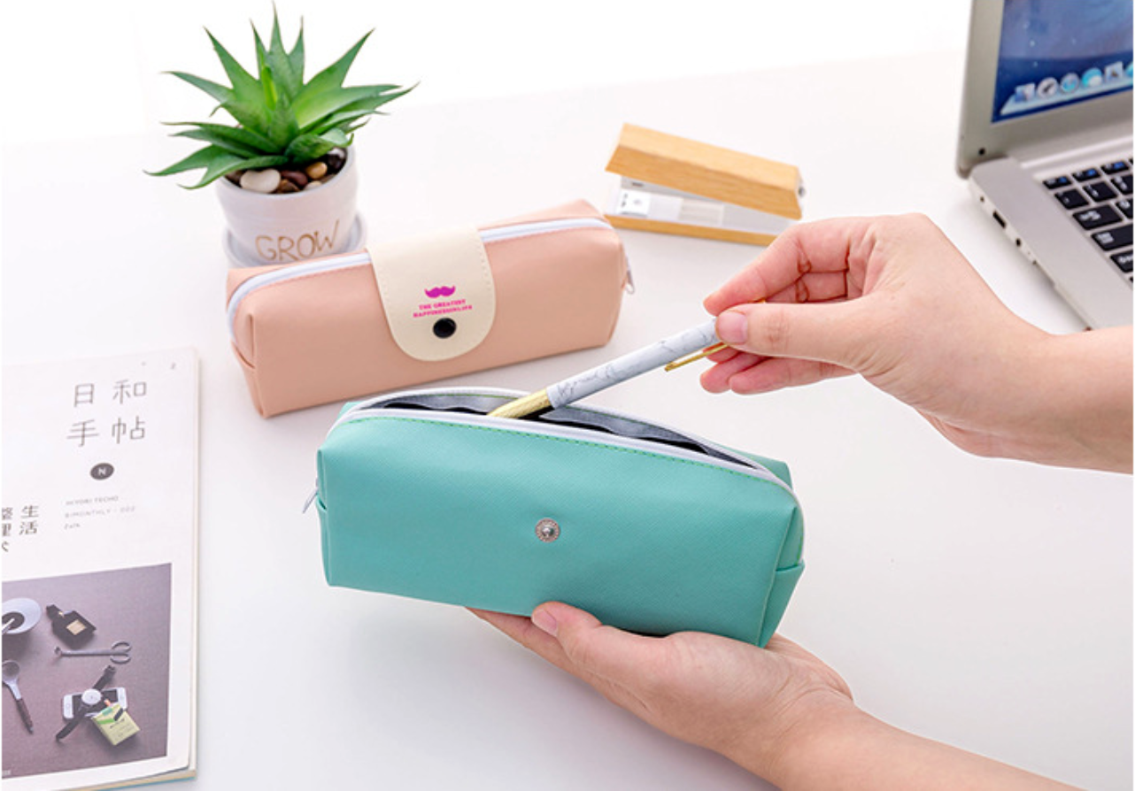 This cute pastel color pencil case is made out of PU leather and it is waterproof. It is very spacious and can carry a large amount of pens and writting supplies. It's perfect to carry to school.